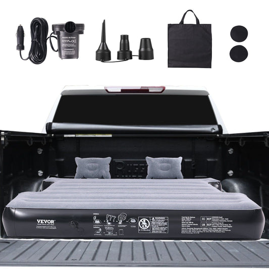 VEVOR Truck Bed Air Mattress – Inflatable Bed for 5.5-5.8 ft Truck Beds, 12V Pump, 2 Pillows, Carry Bag for Silverado, RAM, F-SeriesHighlights Premium Materials Crafted from high-quality materials, the truck bed air mattress features a flocking PVC top, durable PVC sides, and a Tuff polyester PVC bottom with a 0.016"/0.4mm thickness. It boasts waterproof, puncture-resistant, and leak-resistant qualities, ensuring long-lasting comfort for your outdoor adventures. The air mattress provides an excellent...