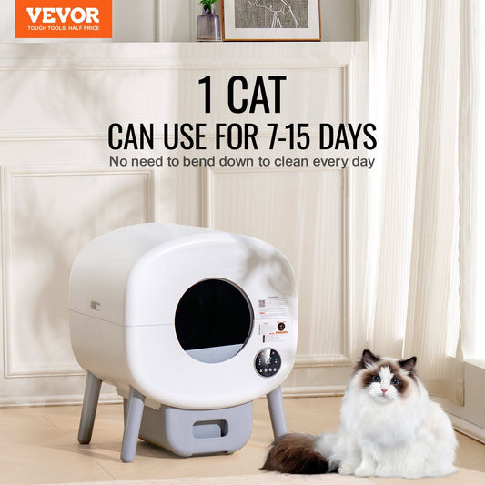 VEVOR 75L Self-Cleaning Cat Litter Box – Odor Control, APP Smart Sensor, GrayHIGHLIGHTS SMART CAT LITTER BOX Offers both automatic and manual modes In automatic mode, the body rotates to filter and separate waste into a 3.43-gallon (13L) collection bin Manual mode available for hands-on litter management Waste bin lasts 7–15 days for one cat—ideal for travel or busy schedules ODOR CONTROL...