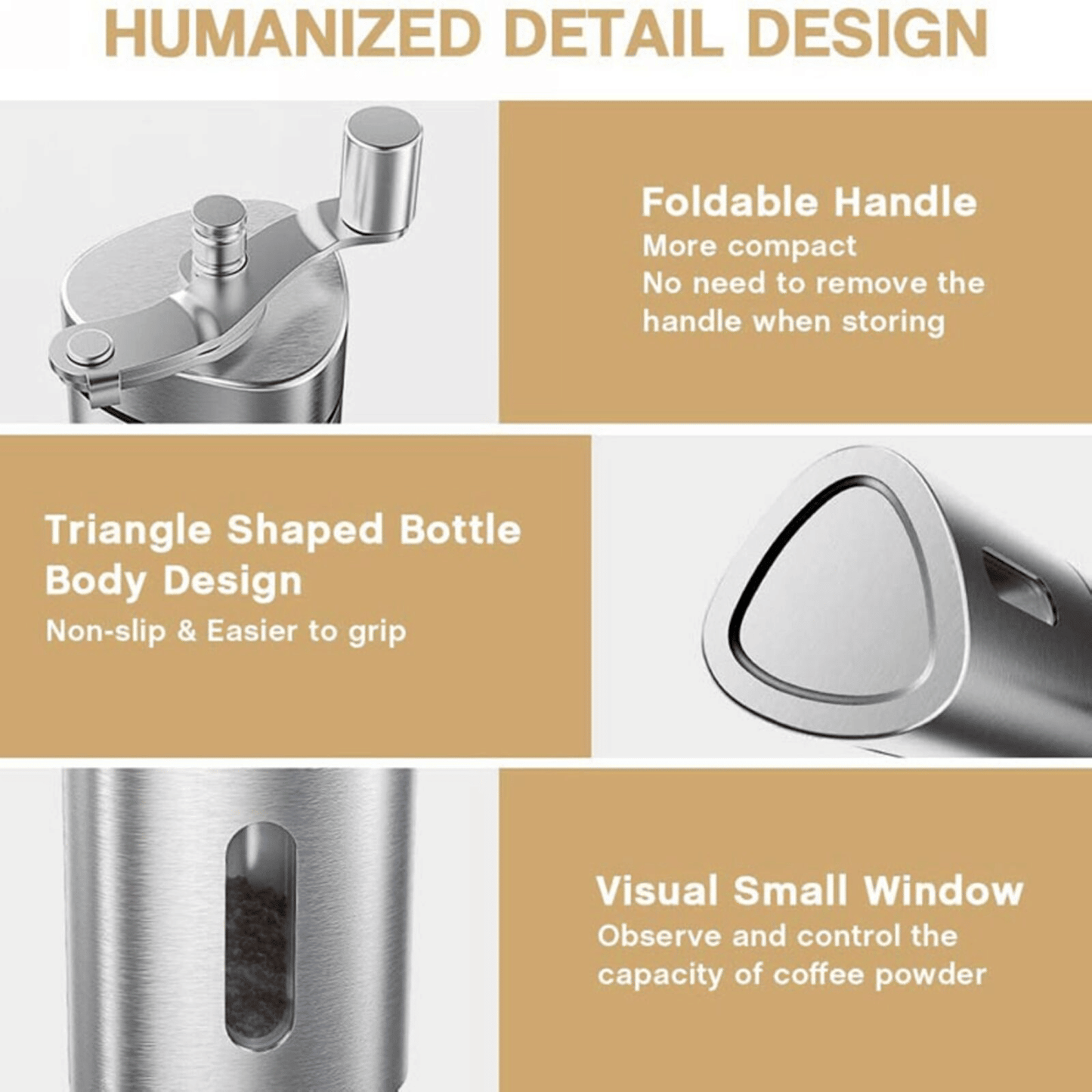 Durable Stainless Steel Construction: Made with high-quality food-grade stainless steel, this grinder is more durable and reliable than plastic or glass grinders. The wear-resistant ceramic burrs ensure a longer lifespan, while the ergonomic triangular body offers stability and a comfortable grip.