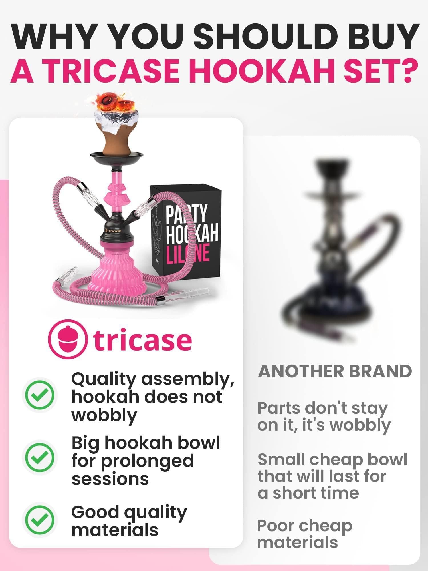 German Quality: The Tricase hookah set boasts high-quality materials, including a rust-free aluminum stem, a thick glass base, and durable hoses without metal wire, all backed by German quality inspections for reliable performance.