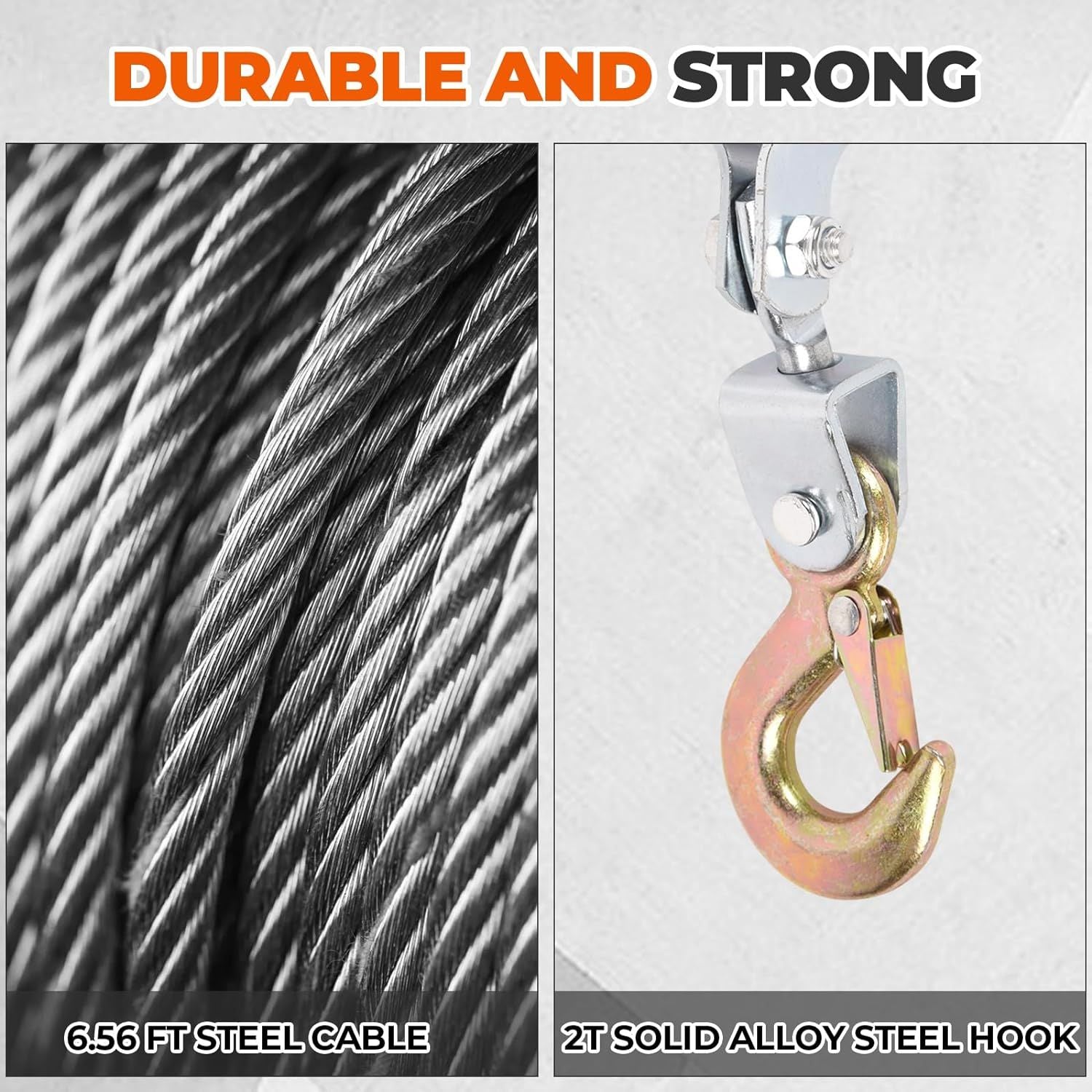 High-Quality Steel Construction: This 2 Ton (4,400 Lbs) cable winch puller is built with hardened steel, offering exceptional durability. The galvanized finish provides anti-corrosion and rust resistance, making it ideal for outdoor use in all weather conditions.